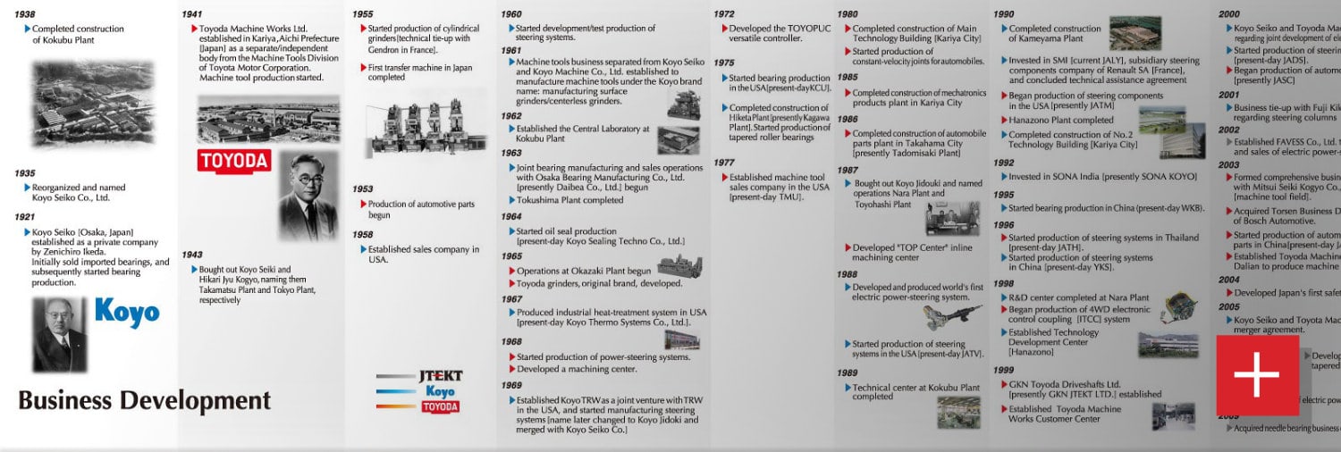 JTEKT Corporation was established in January 2006 through the merger of Koyo Seiko Co., Ltd., a world-class bearing manufacturer, and Toyoda Machine Works, Ltd., a machine tool manufacturer excelling in world-leading machining technologies.