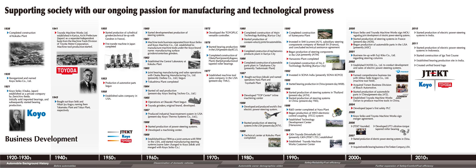 JTEKT Corporation was established in January 2006 through the merger of Koyo Seiko Co., Ltd., a world-class bearing manufacturer, and Toyoda Machine Works, Ltd., a machine tool manufacturer excelling in world-leading machining technologies.