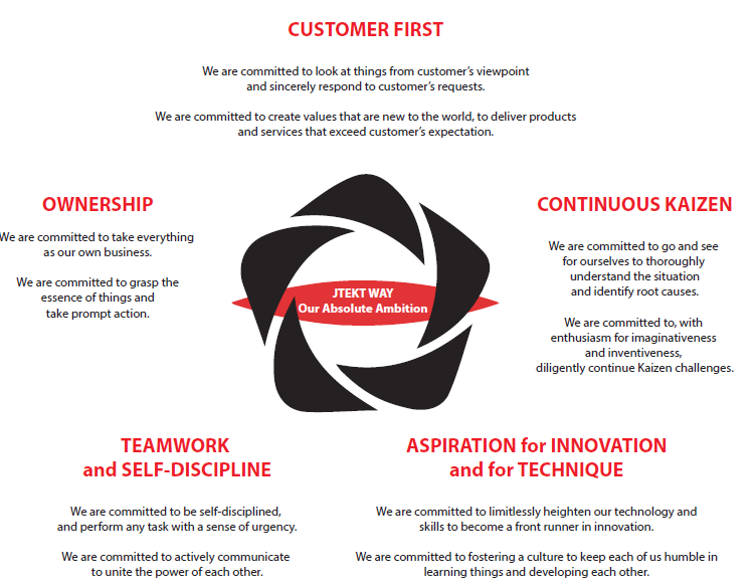 Part of our Guiding Principles, the JTEKT Way is the embodiment of the idea that JTEKT is a value that should be cherished in order to achieve the purpose of corporation and Vision of being Preferred by all stakeholders.